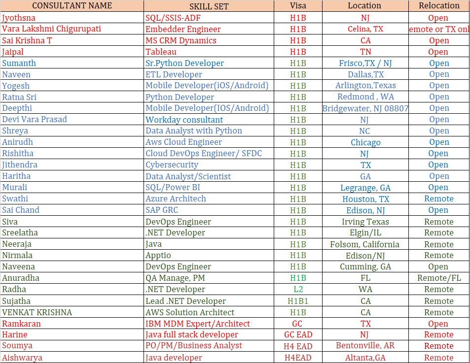 http://bit.ly/4ey8w48 https://jobs.nvoids.com/job_details.jsp?id=2215821&uid= Hi, I hope you are doing great! This is Henry from Binary Computer Int'l Corp I do have a consultant on my bench looking for an immediate project. Please find the below Updated Hotlist and let me know if you have any suitable requirements on C2C Name: Mohammed AbdulSaqib Experience: 9+ Visa Status: Location: Virginia (Relocated Anywhere in US) Role: AWS Cloud/DevOps Engineer Name: JITHENDRA Experience: 9+ Visa Status: Location: Denton , Texas Relocated Anywhere in US) Role: Sr. Cyber Security Analyst Name: Ram Karan Experience: 24+ Visa Status: Location: Frisco, Texas Relocated Anywhere in US) Role: MDM Developer / AI / ML Name: Vara Lakshmi Chigurupati Experience: 15+ Visa Status: Location: Celina, TX (Relocated Anywhere in US) Role: Embedder Engineer Thanks & Regards Henry SR. Technical Recruiter / Bench Sales 50 Cragwood Road, Suite 209, South Plainfield, NJ 07080 Email Id: [email protected] LinkedIn: linkedin.com/in/mohd-fahad-henry-b4bb95251 Office: 732 913 8429 Phone no: 9160443404 "Best way to reach me is by email" From: [email protected] <[email protected]> on behalf of Rohini Yewale <[email protected]> Sent: Thursday, February 27, 2025 9:54 AM To: [email protected] <[email protected]> Subject: Updated C2C Hotlist-27th Feb Dear Recruiters, Please find the HOT LIST of my Consultants who are available immediately for your positions and I request you to send me your job requirements on a daily basis and add me to your distribution list. Mail ID : [email protected] Phone : 609-632-0621 Ext: 189 Sr.No. Name Primary Skill Visa Status Available For EXP 1 Nagesh SAP EWM Remote Only 17+ 2 Pradeep SAS Developer Remote Only 17 3 Vinod SAP ABAP/BTP/Fiori Consultant Remote 11+ 4 S T Windchill PLM Consultant Remote 13+ 5 Terry SAP Project/Program Manager EWM Remote/FL 20+ 6 Shikha Node.Js Develoepr/MERN Stack Developer S Remote/GA 8+ 7 TR SAP BPC/BW/SAC Remote/EST 15+ 8 Vishali Data Analyst/BI Remote/TX 14+ 9 Sangeeta SAP FICO Remote/Onsite 15+ 10 Susmita QA Manager Remote/TX 14+ 11 Arvindham AI Data Engineer/Data Scientist/AI ML Remote/Open 20+ 12 Sridhar SAP SD/OTC/MM Project Lead Remote/NC 20+ 13 Chandra SAP Project Manager Remote only 15+ 14 Pravallika SAP GRC Security Remote 10 15 Pranavi ETL QA Tester Remote/TX 7 16 Dhwani Pharma Business Analyst/BSA Remote/NJ 10+ 17 Savitha Pega Business Architect/Product Owner Open 15 18 Gayathri Salesforce Business Analyst Remote/EST 10 19 Ravi .NET Developer Remote/EST,CST 12+ 20 Komal Data Analyst Remote/NJ 9+ 21 Mohammed Full Stack Lead/MERN Stack Developer Remote/EST,CST 15+ 22 Rinky PharmaProduct Manager/Business Analyst Remote/CA 15+ Please Send Your Daily Requirement at [email protected] Phone: 609-632-0621 Ext 189 Thanks & Regards, Rohini Yewale | 609-632-0621 Ext 189 Email: [email protected] LinkedIn: https://www.linkedin.com/in/rohiniyewale/ Quantum Integrators Group, LLC 196 Princeton-Hightstown Rd. Suite 1B-7 West Windsor, NJ 8550. A Certified Minority Women owned Small Business Enterprise (MWBE, SBE). SAP Silver Level Partner !! -- To view this discussion visit -- Keywords: quality analyst artificial intelligence machine learning javascript access management materials management business intelligence information technology business works card California Florida Georgia Idaho New Jersey North Carolina South Dakota Texas Updated C2C Hotlist-27th Feb [email protected] hotlist http://bit.ly/4ey8w48 https://jobs.nvoids.com/job_details.jsp?id=2215821&uid= |