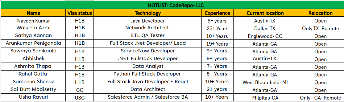 Arun .NET Developer 19 GA Open to Relocate H1B Abhishek .NET Developer 9+ TX Open to Relocate H1B Sai Data Architect 21 GA Open to Relocate GC Waseem Network Architect 21 TX Only - Remote H1B Ashmita Data Engineer 7+ GA Open to Relocate H1B Usha Salesforce BA/Admin 11 Local to CA - Remote USC Naveen Java Full Stack Developer 8+ TX Open to Relocate H1B Rahul Python Developer 8+ GA Open to Relocate H1B Sathya ETL Tester 9 CO Only/ Remote H1B Sameena Sr. Full Stack React 10+ MI Open to Relocate H1B Keywords: business analyst green card California Colorado Georgia Michigan Texas |