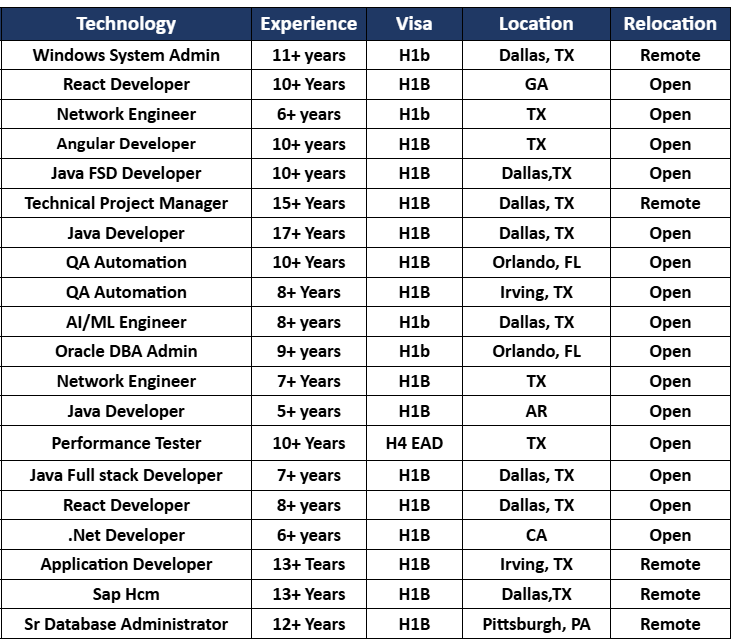 Consultant Name Technology Experience Visa Location Relocation 1 Aditya Ganni Windows System Admin 11+ years H1b Dallas, TX Remote 2 Jagadeesh React Developer 10+ Years H1B GA Open 3 Charan Sai Network Engineer 6+ years H1b TX Open 4 Swathi Angular Developer 10+ years H1B TX Open 5 Gopinath Java FSD Developer 10+ years H1B Dallas,TX Open 6 Sri Manidhar Technical Project Manager 15+ Years H1B Dallas, TX Remote 7 Venkata Kishore Java Developer 17+ Years H1B Dallas, TX Open 8 Srilatha QA Automation 10+ Years H1B Orlando, FL Open 9 Sai Adireddy QA Automation 8+ Years H1B Irving, TX Open 10 Sushma AI/ML Engineer 8+ years H1b Dallas, TX Open 11 Krishna Sai Nama Oracle DBA Admin 9+ years H1b Orlando, FL Open 12 Goutham Kosaraju Network Engineer 7+ Years H1B TX Open 13 Neeshma Java Developer 5+ years H1B AR Remote 14 Pooja Performance Tester 10+ Years H4 EAD TX Open 15 Karthik Reddy Java Full stack Developer 7+ years H1B Dallas, TX Open 16 Sneha V React Developer 8+ years H1B Dallas, TX Open 17 Sahithi .Net Developer 6+ years H1B CA Open 18 Bhavani Pandranki Application Developer 13+ Tears H1B Irving, TX Open 19 Sushma Sap Hcm 13+ Years H1B Dallas,TX Open -- Keywords: quality analyst artificial intelligence machine learning Arkansas California Florida Georgia Texas |