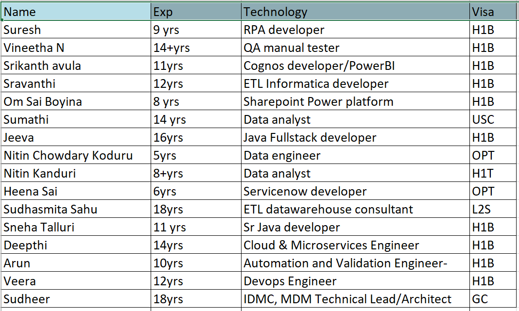 Suresh 9 yrs RPA developer H1B Vineetha N 14+yrs QA manual tester H1B Srikanth avula 11yrs Cognos developer/PowerBI H1B Sravanthi 12yrs GEN AI H1B Om Sai Boyina 8 yrs Sharepoint Power platform H1B Sumathi 14 yrs Data analyst USC Jeeva 16yrs Java Fullstack developer H1B Nitin Chowdary Koduru 5yrs Data engineer OPT Nitin Kanduri 8+yrs Data analyst H1T Heena Sai 6yrs Servicenow developer OPT Sudhasmita Sahu 18yrs ETL datawarehouse consultant L2S Sneha Talluri 11 yrs Sr Java developer H1B Deepthi 14yrs Cloud & Microservices Engineer H1B Arun 10yrs Automation and Validation Engineer- H1B Veera 12yrs Devops Engineer H1B Sudheer 18yrs IDMC, MDM Technical Lead/Architect GC Keywords: quality analyst green card Keywords: quality analyst artificial intelligence green card |